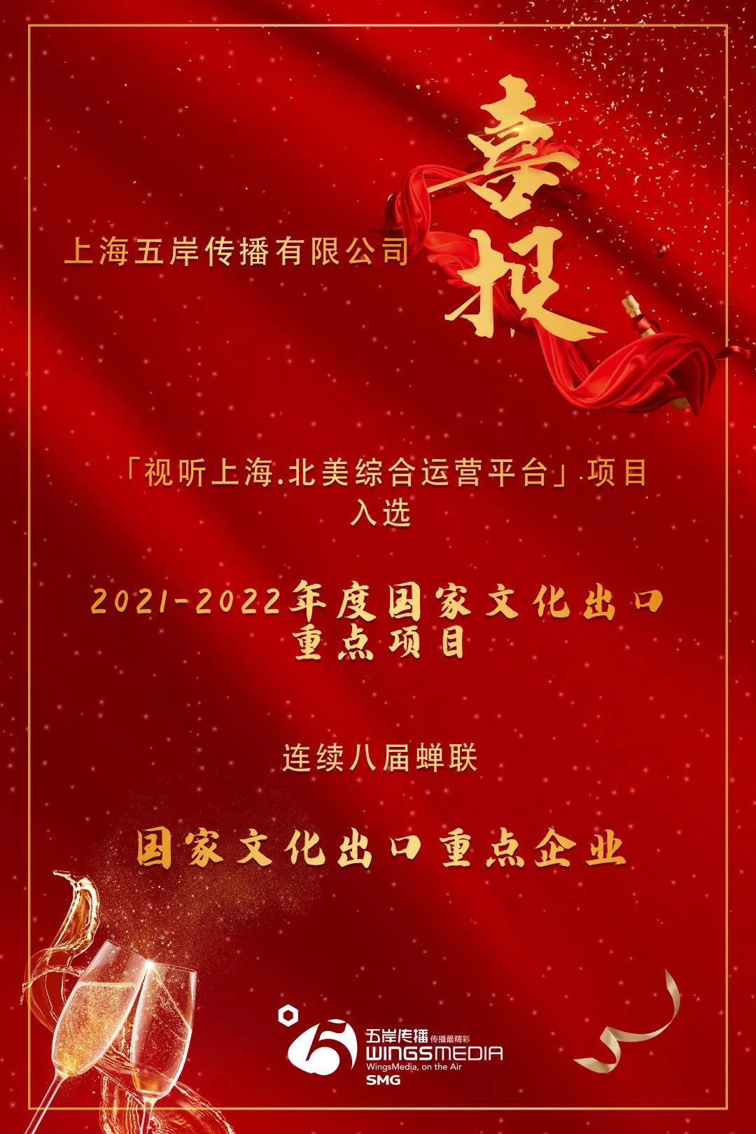 近日,由商务部、中宣部、财政部、文化和旅游部、广电总局共同认定的“2021-2022年度国家文化出口重点企业”名单正式对外公布,上海五岸传播有限公司凭借多年来深耕海外的出色表现和全球化战略拓展成功上榜,连续八届16年蝉联这一殊荣;与此同时,五岸传播策划运营的“视听上海.北美综合运营平台”也同步入选“2021-2022年度国家文化出口重点项目”。