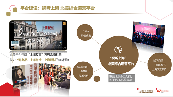 “视听上海·北美综合运营平台”是五岸传播为北美观众个性化打造的中国影视运营平台。目前平台覆盖北美3.3亿人口,媒体输出平台包括美国电视、ROKU OTT、亚马逊等电视和新媒体平台,合作形式为时段合作和专区化运营;同时,在文化交流活动方面策划和实施了“欢乐春节”等系列线下活动等。自此建立了全媒体传播矩阵,为北美综合运营平台打下基础,为北美带去大量讲述中国故事和中国元素的影视内容。