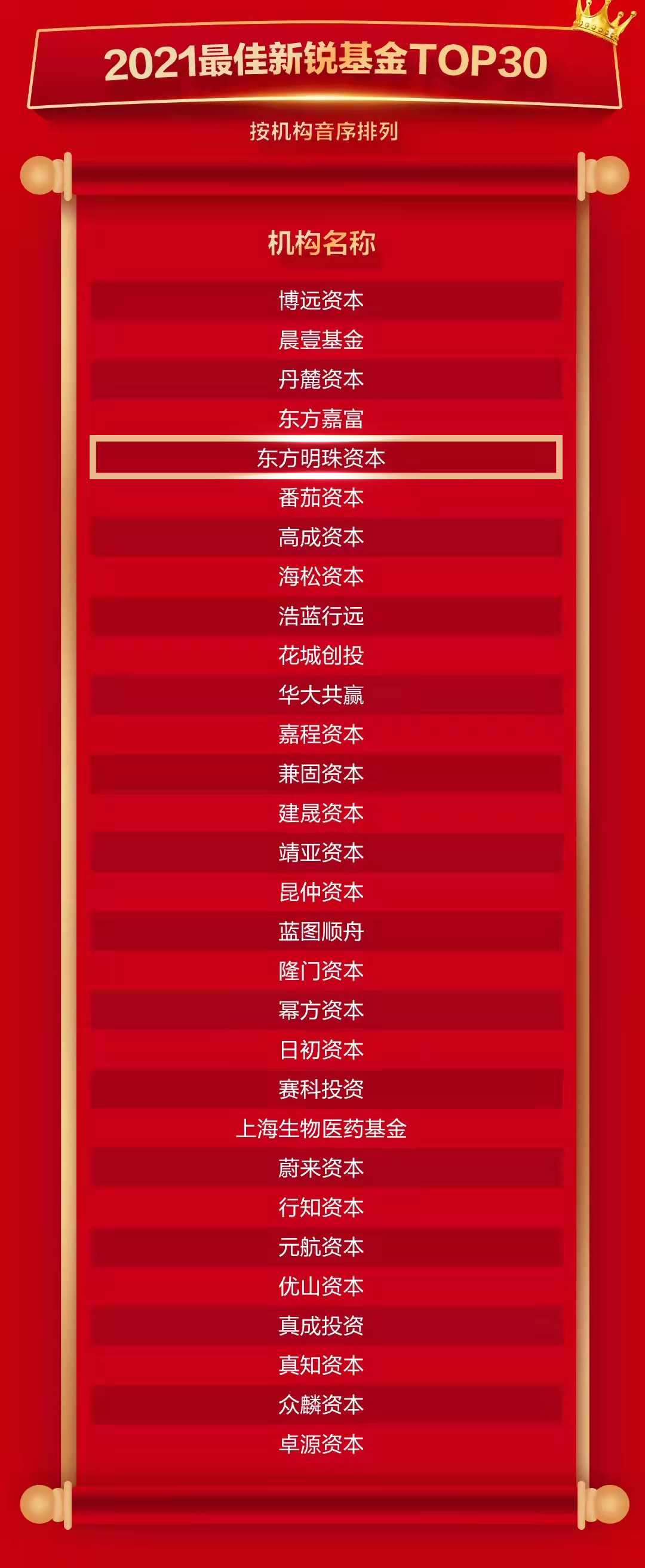 近日,东方明珠新媒体股份有限公司(东方明珠新媒体)旗下东方明珠资本连下两城:在36氪发布的第四届「中国最受创业者欢迎投资机构/投资人」百强评选榜单中,东方明珠资本荣获「2021年中国最受创业者欢迎创业投资机构TOP100」;在母基金研究中心(www.china-fof.com)发布的“2021年中榜单”中,东方明珠资本荣膺「2021年中国最佳新锐基金TOP30」,两项入围成绩标志其过往投资业绩、差异化投资模式以及产业共创能力得到了行业一致认可。 36氪 2021年中国最受创业者欢迎创业投资机构TOP100 母基金研究中心 2021年最佳新锐基金TOP30 「中国最受创业者欢迎投资机构 /投资人」百强 由36氪创投研究院重点调研359家投资机构、298位投资人的业绩数据,将投资机构、投资人在募、投、管、退四个维度的业绩作为评价基础(占比80%),辅以面向广大创业者群体、持续10天的「Pick你最喜爱的投资人/投资机构」投票征集活动(占比20%),最终评选得出。 母基金研究中心「2021年中榜单」 母基金研究中心是根据《国务院关于促进创业投资持续健康发展的若干意见》中“鼓励和规范发展市场化运作、专业化管理的创业投资母基金”的精神,顺应国内母基金行业迎来发展春天的大趋势而设立的非营利性的平台。“中榜单”将机构长期生存发展、持续产生回报、践行社会责任等方面的表现作为重要指标,旨在发掘行业内最具长期力量和商业智慧的引领者。 东方明珠资本(东方明珠传媒产业基金)是上海文化广播影视集团有限公司(SMG)、东方明珠新媒体倾力打造的产业投资基金,于2018年起正式成立运营。作为公司外延发展的主要工具之一,基金围绕BesTV+流媒体战略,以产业+资本联动的方式,进行前瞻性战略、产业协同等方面布局,利用SMG、东方明珠新媒体产业资源及政策优势,聚焦流媒体上下游产业生态,构筑内外双修的企业高价值成长空间,助力打造中国领先的新型文化产业集团。 东方明珠资本秉持独立研究、独立投资的策略,不盲目追逐热点,主要投资高速成长及成熟阶段项目,以国内IPO尤其以科创板拟上市企业为主要投资目标。成立三年以来,已经完成10个项目投资,总投资金额超10亿人民币,其中奥比中光、影谱科技、依图科技、五一视界、明略科技等已投项目都已进入IPO阶段,即将迎来投资丰收阶段。 同时,东方明珠资本二期基金已在积极筹备过程中,目前已获得国家级母基金科技部旗下科技成果转化母基金、中科院旗下长期投资母基金、中金启元、建信资本及基金一期出资人的认可。 东方明珠新媒体作为SMG旗下统一的产业平台和资本平台,始终坚持内生式增长与外延式发展并举模式,紧密围绕BesTV+流媒体战略,遵循“产业运营+资本运作”原则,以资本促进业务合作,以业务协同加强资本联动,从而加速夯实综合实力,实现产业价值和资本价值的共同增值。未来,公司将持续放大资本杠杆效应及资源叠加效应,不断提升产业资源吸附和聚集能力,以投资赋增长,打造企业新的增长极。