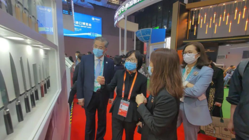 上海广播电视台、上海文化广播影视集团有限公司党委书记、董事长、东方明珠新媒体股份有限公司党委书记、董事长王建军,东方明珠新媒体股份有限公司总裁徐辉在本届进博会上参观体验东方购物合作伙伴参展商的全新产品