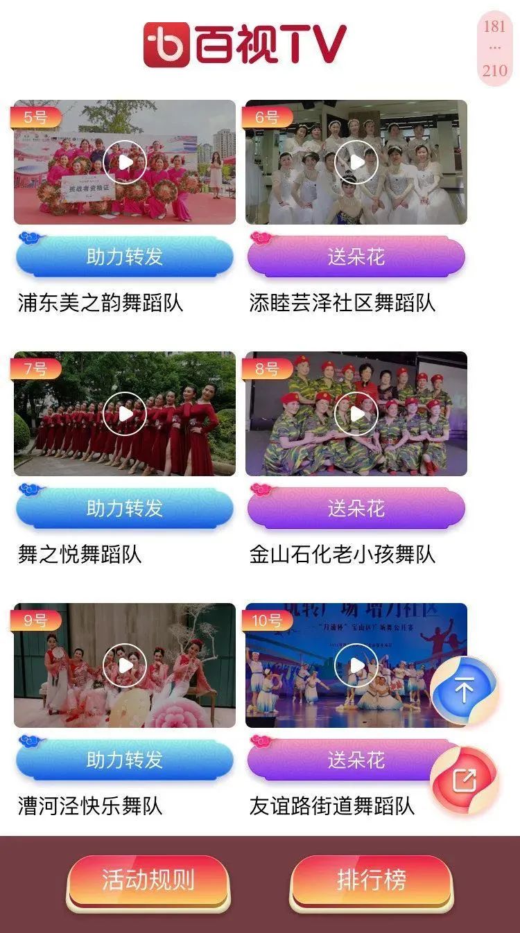 观众可通过手机安装百视TV APP、进入金色学堂“广场大民星”专区,参与网络“送花”投票。不仅可以通过“送朵花”“助力转发”等方式为自己喜爱的队伍加油助威;还可以通过“送花”投票,为入围初赛的队伍,在初赛环节赢得额外的才艺表演时间。