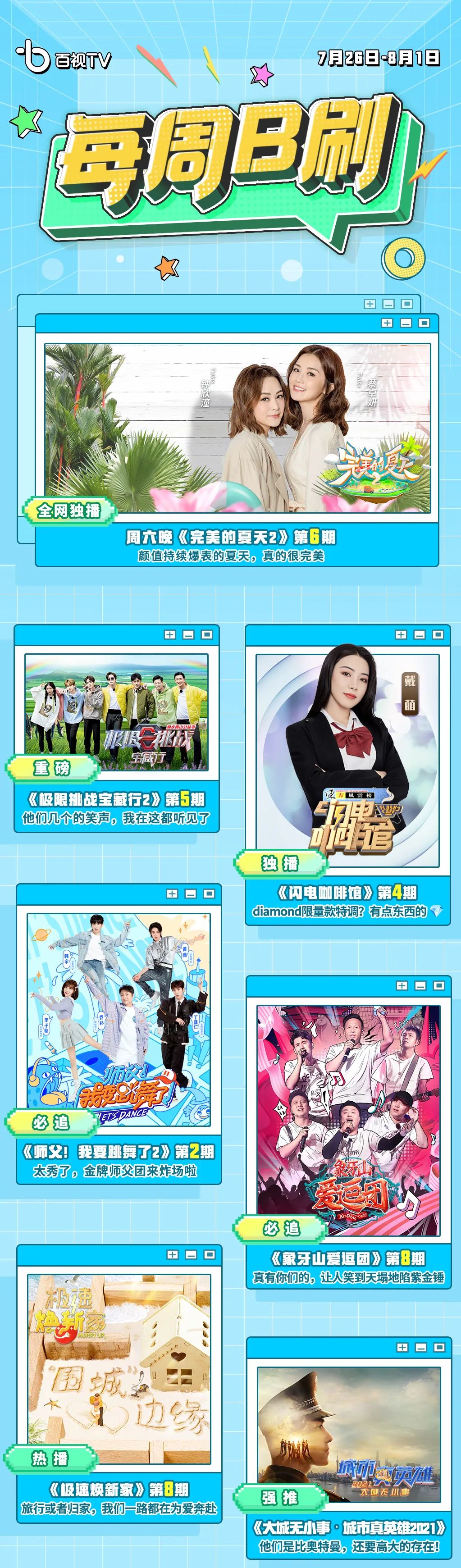 此外,百视TV App与优酷进行版权合作,联合播出两档不同类型的综艺:《象牙山爱逗团》、《师父!我要跳舞了2》;同步播出的东方卫视王牌节目新一季的内容,包括全景式警务侦查纪录片《大城无小事——城市真英雄2021》和由《梦想改造家》团队打造的全新家装改造类节目《极速焕新家》;更有8月9日在上海梅赛德斯—奔驰文化中心举行的2021第28届东方风云榜音乐盛典的红毯仪式及颁奖典礼进行全网独家直播,盛典将有张艺兴、王嘉尔、邓紫棋、张靓颖、周深等当红歌手加盟,也及INTO1等新晋热门偶像团体助阵,超级期待呢~