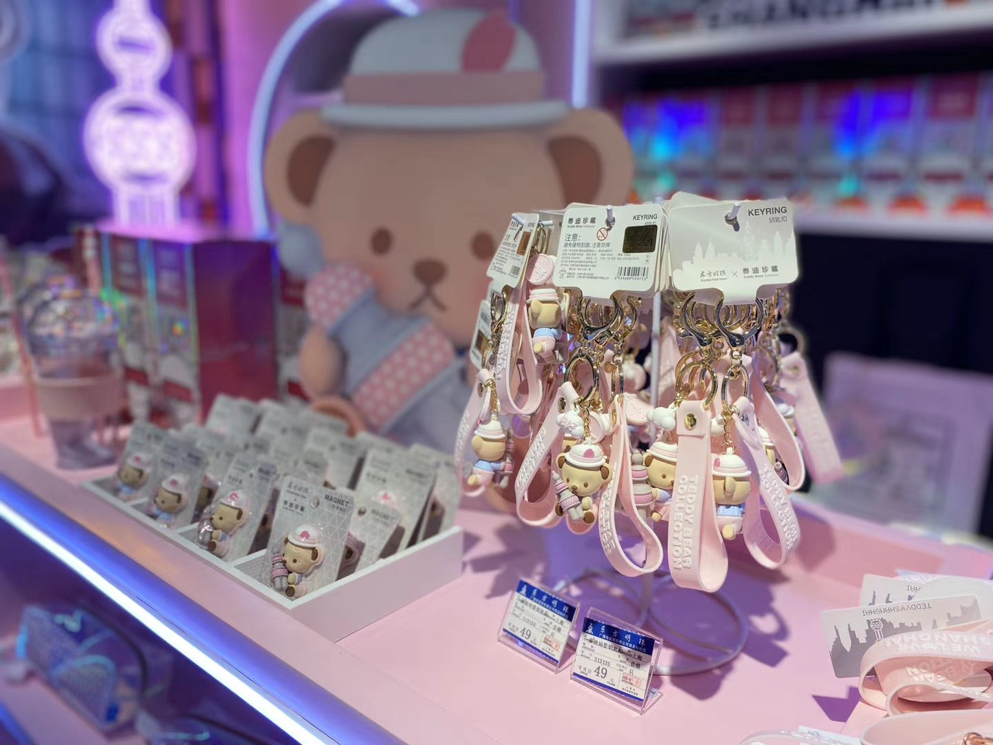 目前明珠文创已有3000个左右的SKU(库存量单位),覆盖食品饮料、服饰、数码、玩具、文具用品、生活用品等多个类别,同时树立了“好而不贵”的亲民化价格体系,比如一件潮流文化衫仅售99元,一个泰迪珍藏IP合作款钥匙挂件不到50元。