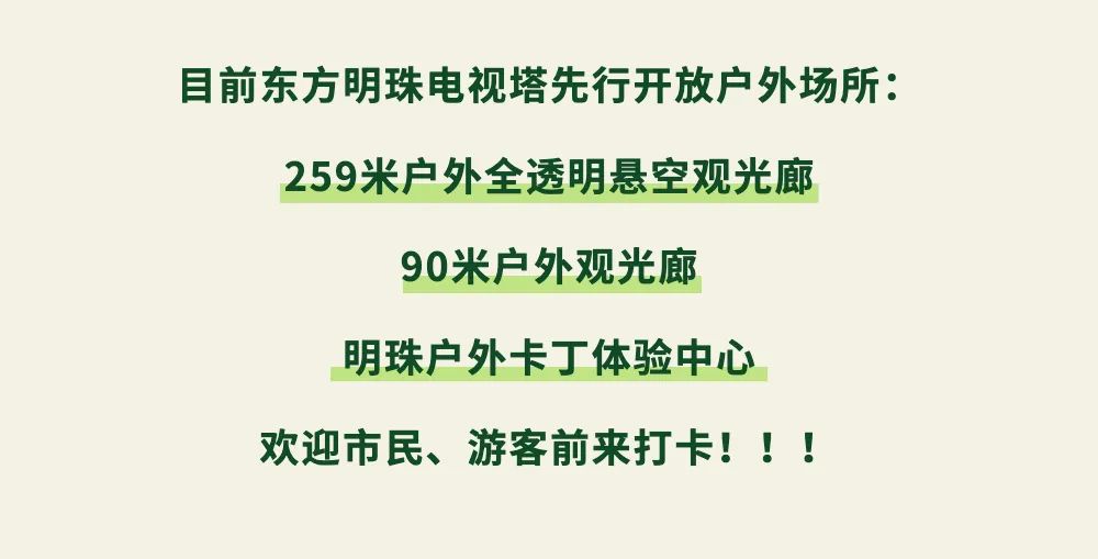 6月1日起,东方明珠塔259米户外全透明悬空观光廊、90米户外观光廊及明珠户外卡丁体验中心将先行开放!6月1日-6月30日,凡身高1.4米(含)以下儿童均享受免费入园参观优惠(小朋友须有成人陪同入塔)。东方明珠电视塔也将严格落实防疫工作做好安全保障措施,努力打造安全有序的线下游玩场所!先来看看入园须知吧👇