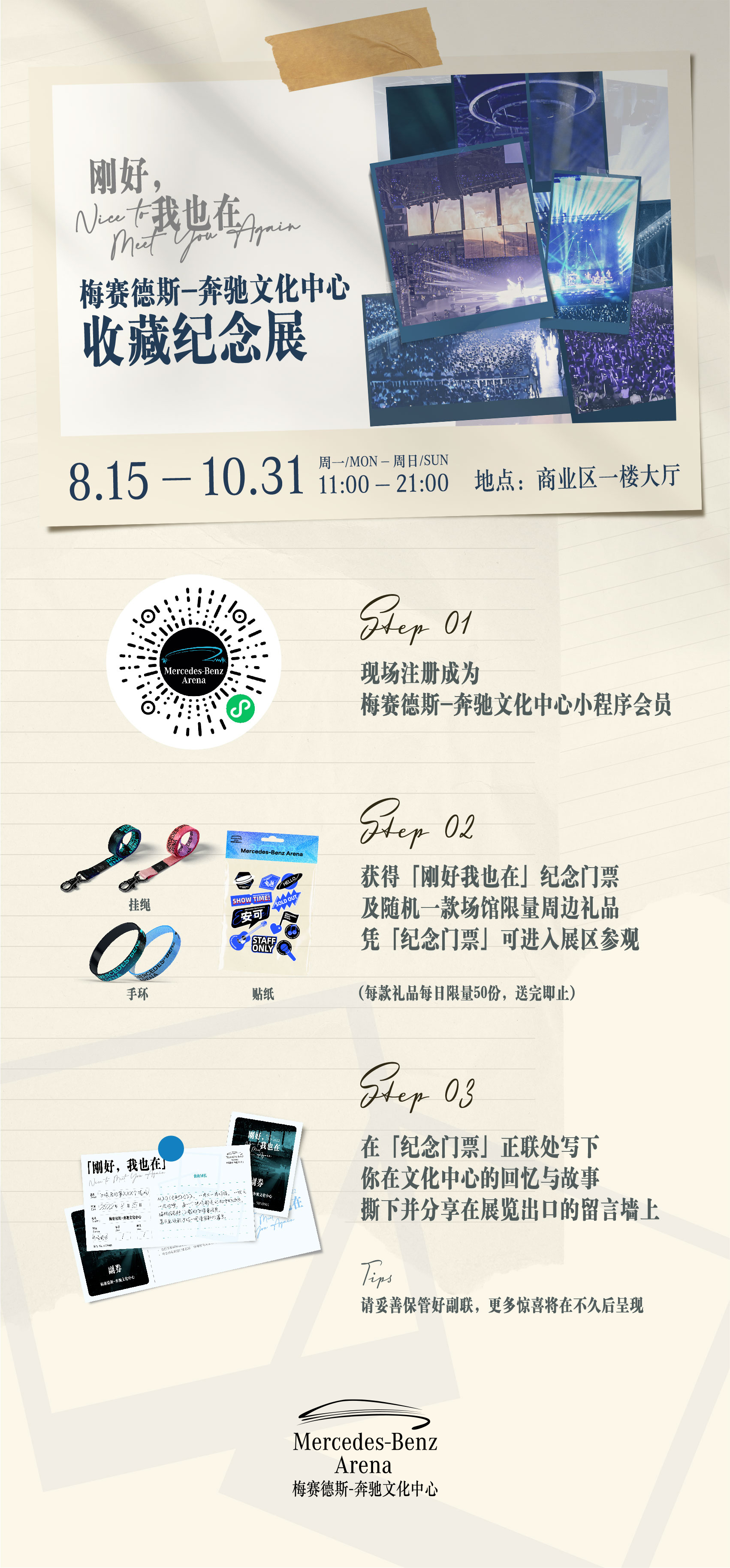 8月15日起,沪上具有活力的先锋娱乐地标,东方明珠新媒体旗下梅赛德斯-奔驰文化中心“刚好,我也在”收藏纪念展正式对公众开放。作为场馆12周年的纪念展,此次收藏纪念展包含四大主题展区,超过50件珍贵收藏品首次亮相,其中不乏国内外知名艺人的签名演唱会海报及国际赛事的专属纪念品,让参观者重温经典,致敬传奇。本次展览将持续至2022年10月31日,观众可以通过现场注册场馆新推出的小程序成为会员,免费领取展览门票及限量周边礼品。