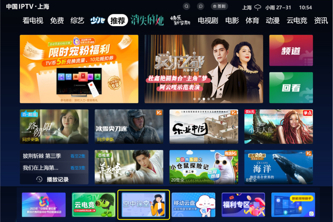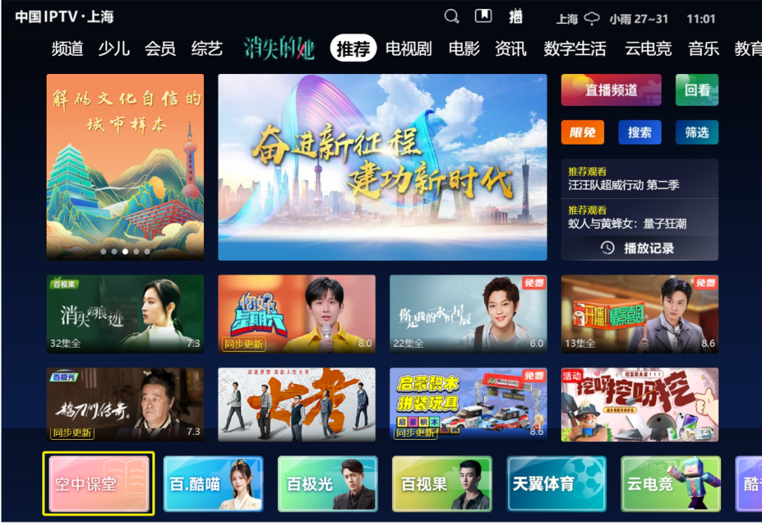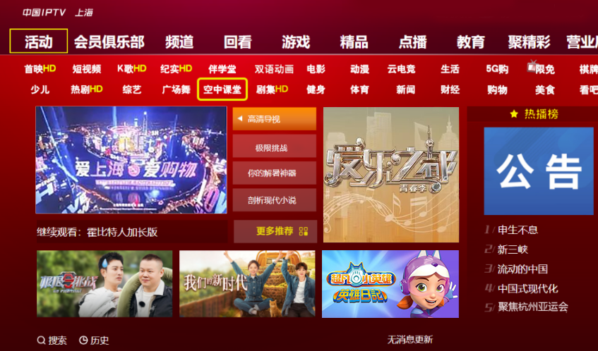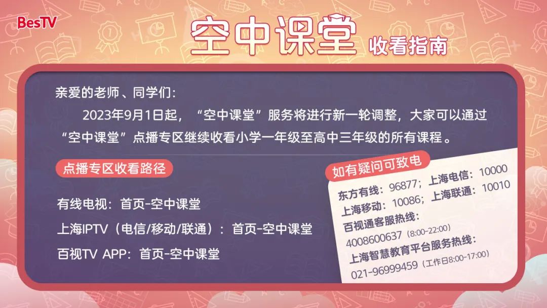 2023年秋季学期即将开始,为持续助力全市中小学线下教学,向广大师生提供教师研修和学生自主学习的数字化服务,在上海市教委指导下,由东方明珠新媒体股份有限公司旗下东方有线电视、百视通IPTV/OTT、百视TV APP等平台提供的“空中课堂”服务将作出新一轮调整:停止12路直播频道课程服务,继续通过东方明珠新媒体旗下各平台点播专区提供小学一年级至高中三年级的学习课程。