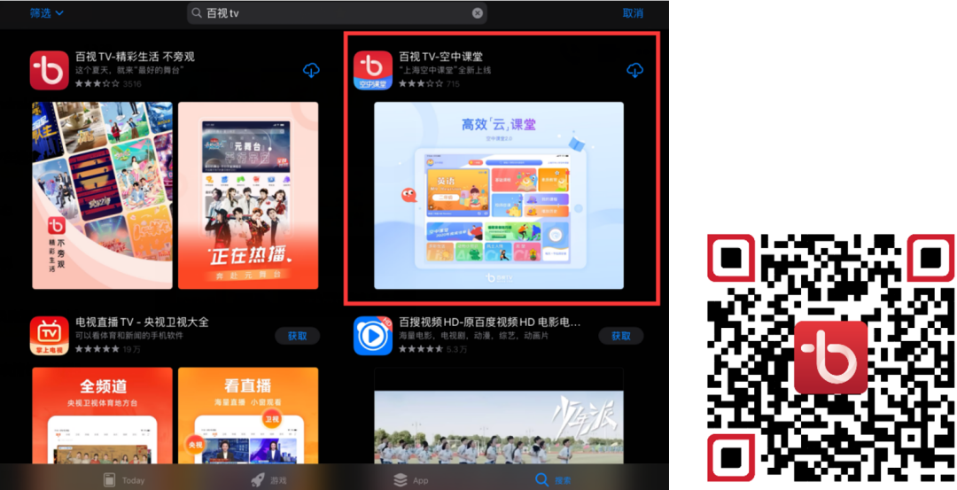 第一步:在App Store下载“百视TV空中课堂”,或扫描下方二维码,直接下载。