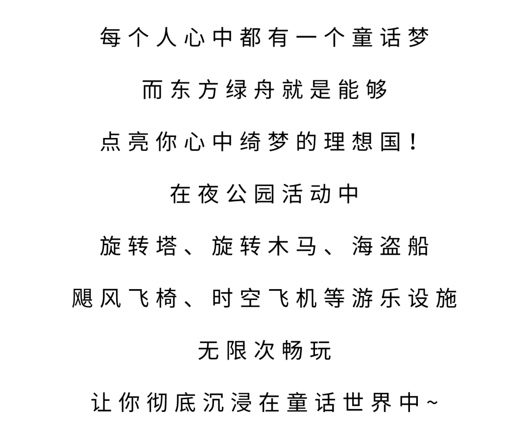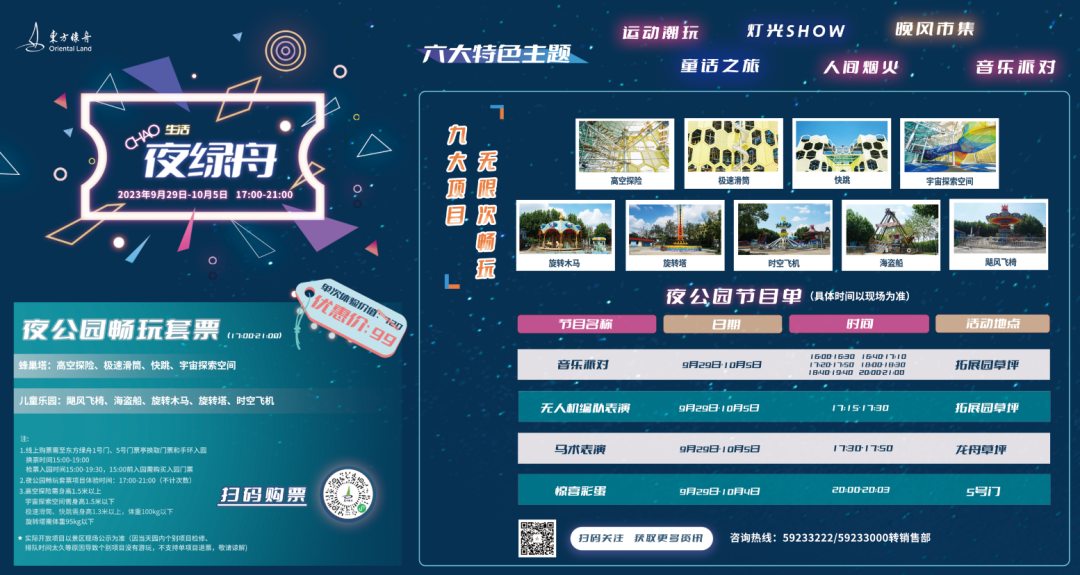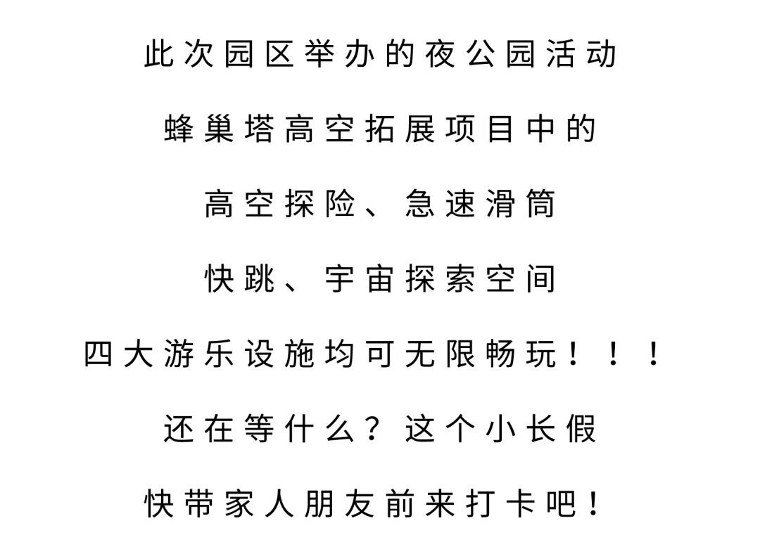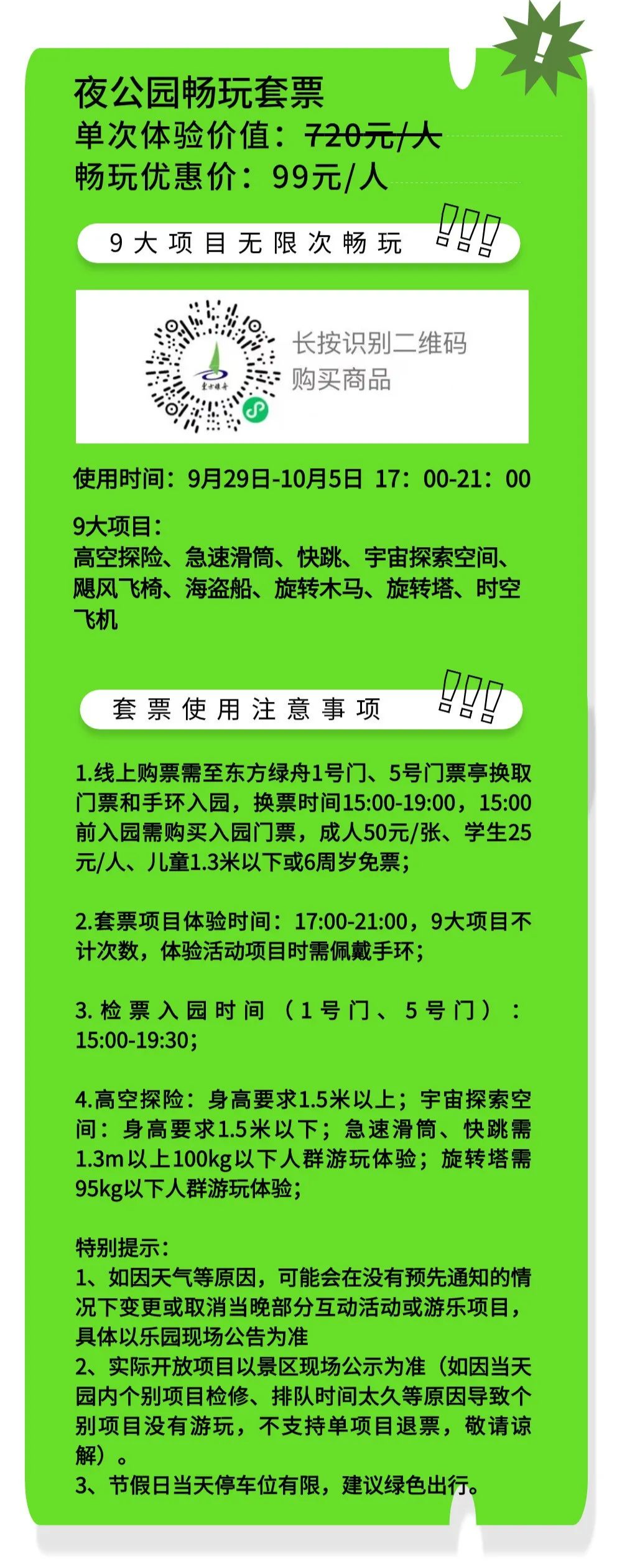 东方绿舟首次推出的“活力夜公园”双节假期惊喜亮相!即日起至10月5日,园区内灯光效果和设施项目全面升级,构筑成绚烂奇幻的空间,让市民游客在长假的夜晚也能玩得尽兴。购买夜公园畅玩套票,高空探险、急速滑筒、快跳、宇宙探索空间、飓风飞椅、海盗船、旋转木马、旋转塔、时空飞机等9大体验项目无限次畅玩。