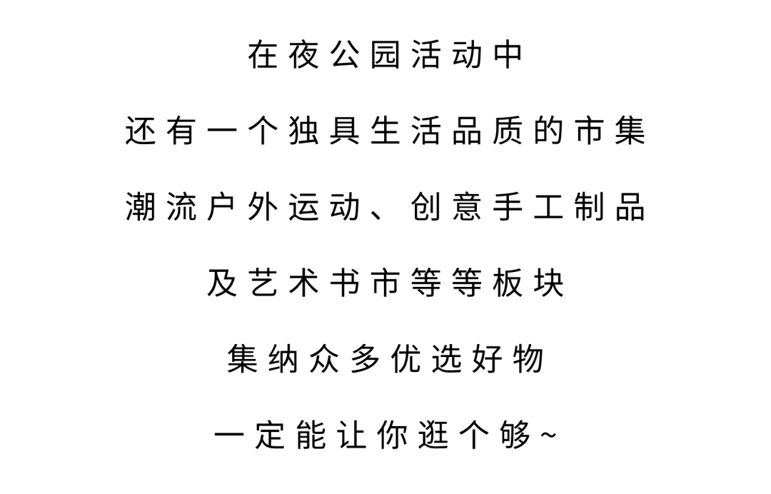 在夜公园活动中,还有独具生活品质的市集,优选潮流户外运动、创意手工制品及艺术书市等众多好物。现场更有酷炫灯光Show、音乐美食、烟花表演等多元主题精彩内容。游客朋友们还可以选择体验野奢露营,在5600亩的天然氧吧里畅快呼吸,和家人朋友们来一场自然治愈之旅。