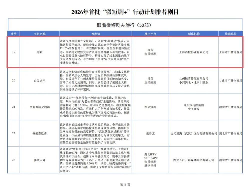 由上海市广播电视局推荐的微短剧《念君》成功入选2026年首批“微短剧+”行动计划推荐剧目的“跟着微短剧去旅行”单元。
