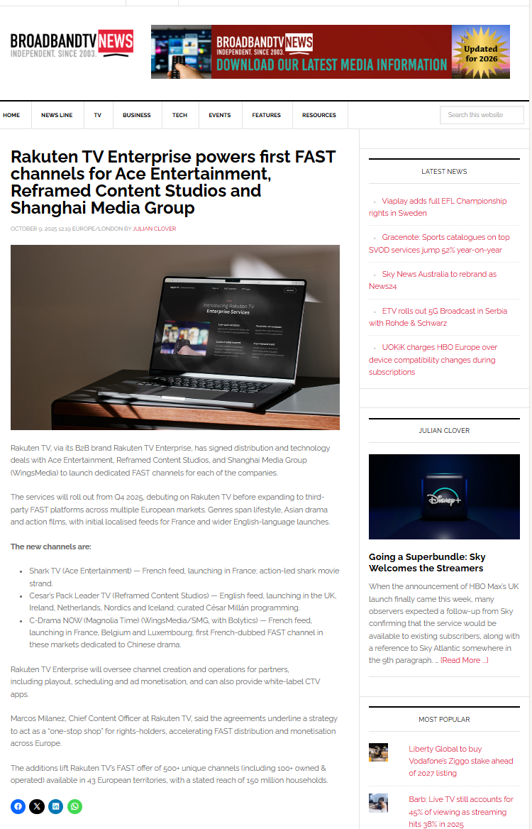 作为首个在法国主流平台常态化运营的亚洲内容FAST频道,法国白玉兰FAST频道不仅是中国内容走向欧洲的视听窗口,更是连接中法文化的重要桥梁。频道采用国际主流的免费广告支持流媒体电视(FAST)模式,通过 “内容授权+技术托管+广告分账+本地运营”的创新合作机制,对接Rakuten TV成熟的基础设施,实现了内容管理、播出编排、广告插入和数据反馈的完整运营闭环,为中国视听内容在海外市场的价值转化与长期发展探索了一套可持续发展模式。